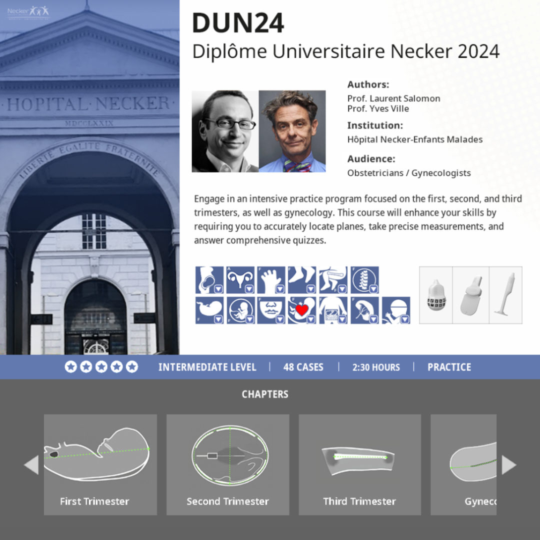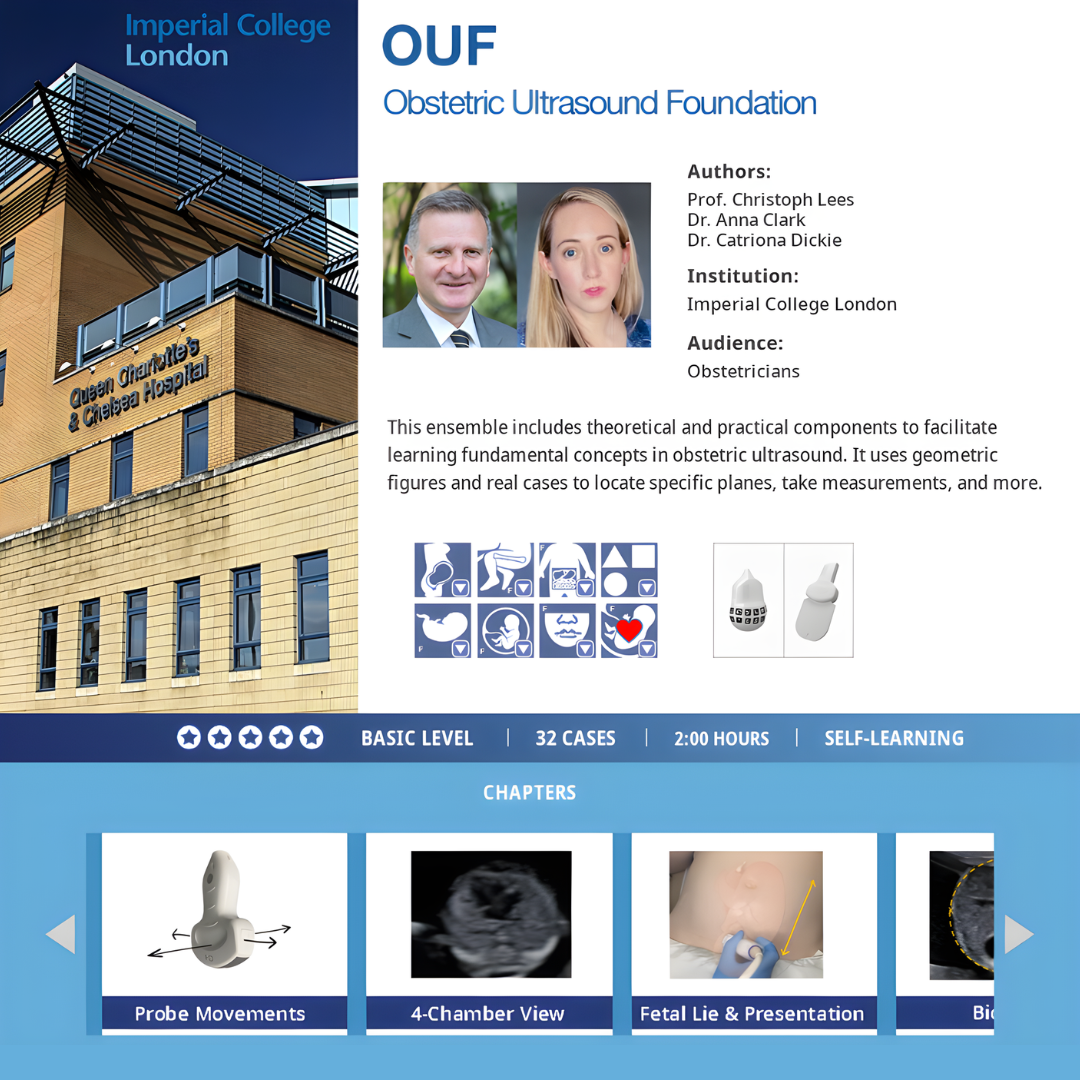 Curriculum-based training covering obstetric and gynecology ultrasound across all trimesters, with guided simulation and quizzes.