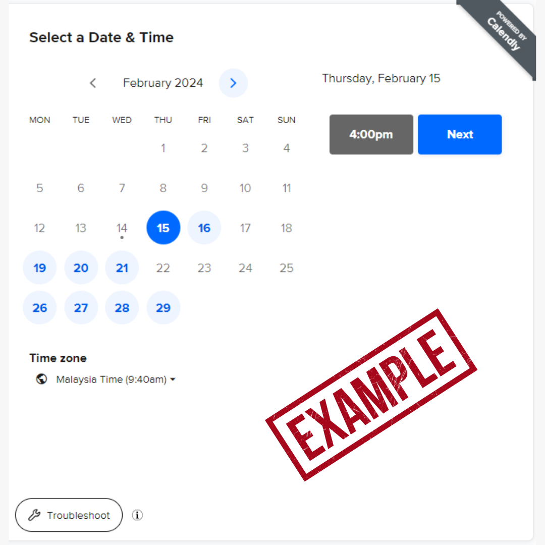 Butiran tarikh slot akan dipamerkan untuk pemilihan selepas tempahan dan pembayaran berjaya dilakukan.